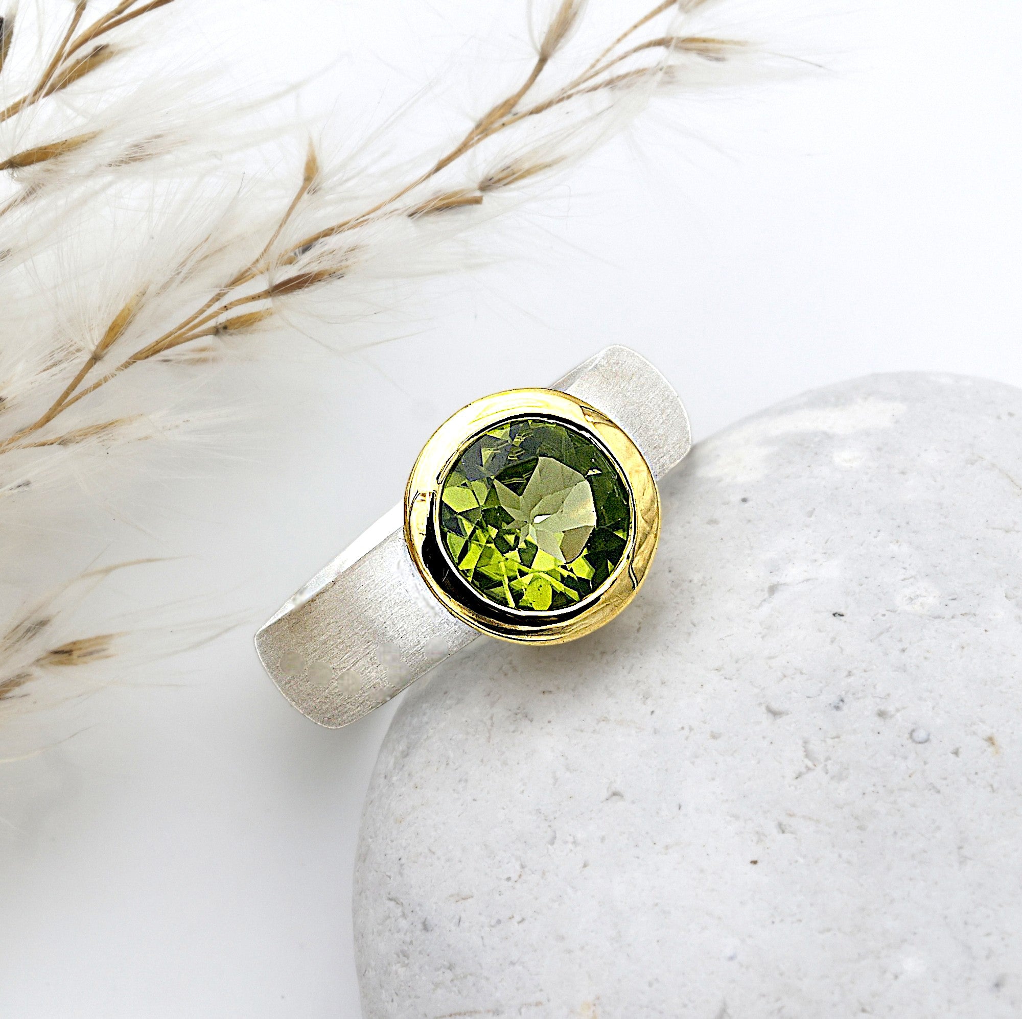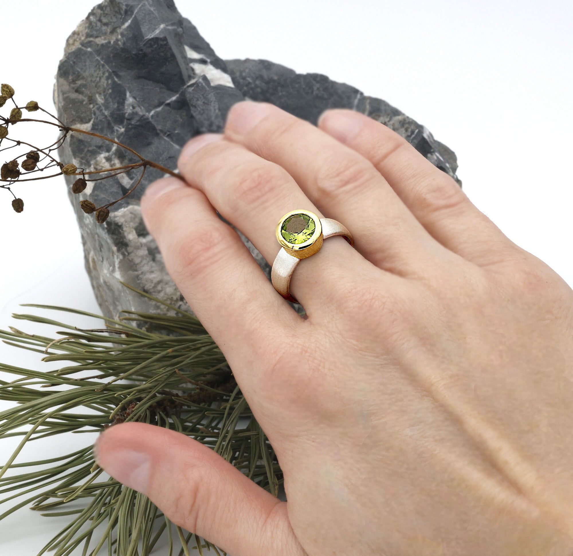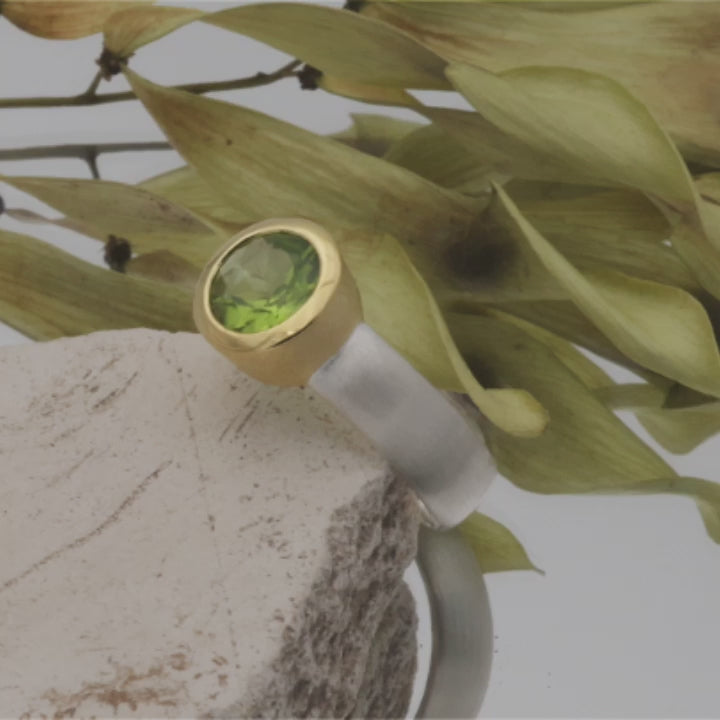 Originaler Ring aus 925er Sterlingsilber, teilvergoldet mit einem echten Peridot.
