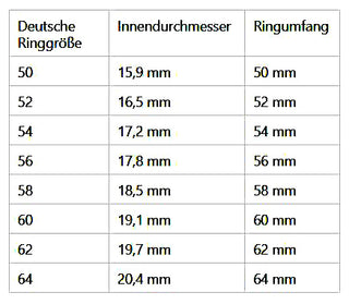 Schau dir einen Ring an, den sie oft trägt, ohne dass sie es merkt. Dann messe den Innendurchmesser. Finde mithilfe der folgenden Tabelle die passende Ringgröße. Für mehr Genauigkeit prüfe auch den Parameter Ringumfang. Dieser steht in derselben Tabelle.